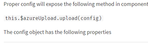 그래서 this.$azureUpload.upload(config) -> this.$azureUpload(config)로 변경해보니 해결되었다. (4년동안 docs에 잘 못 적혀있던 걸까?)