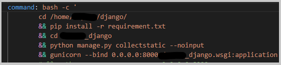 - command는 '-'으로 각각 치는 방식이 아니라, bash를 실행해서 명령어를 전달하는 식으로 사용해야한다. (-c 는 어떤 옵션인지 아직 잘 모르겠다) https://stackoverflow.com/questions/30063907/using-docker-compose-how-to-execute-multiple-commands