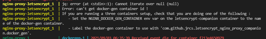 nginx-proxy-letsencrypt_1 | jq: error (at <stdin>:1): Cannot iterate over null (null) nginx-proxy-letsencrypt_1 | Error: can't get docker-gen container id ! nginx-proxy-letsencrypt_1 | If you are running a three containers setup, check that you are doing one of the following : nginx-proxy-letsencrypt_1 | - Set the NGINX_DOCKER_GEN_CONTAINER env var on the letsencrypt-companion container to the name of the docker-gen container. nginx-proxy-letsencrypt_1 | - Label the docker-gen container to use with 'com.github.jrcs.letsencrypt_nginx_proxy_companion.docker_gen'.