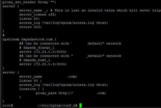 변경된 /etc/nginx/conf.d/default.confdapadastock.com/api 이런식으로 VIRTUAL_HOST를 설정했지만, host자체를 dapadastock.com/api로 보더라. (url로 api가 들어온 것이 아니라) 따라서 동작하지 않았다.