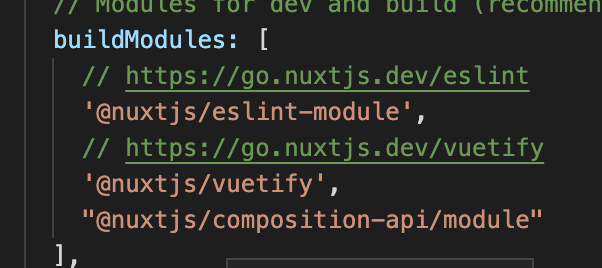 설치 후에 '@nuxtjs/composition-api/module'를 nuxt.config.js의 buildModules에 적어주자