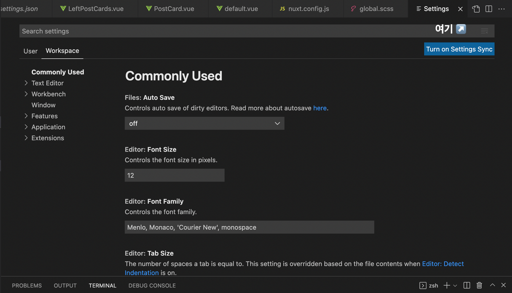 꼭 Workspace를 누르고 이동하자!! default로 설정된 user의 설정으로 이동하면 아마 이것저것 많이 있을테니 올바른 파일로 이동한지 확인해보시라.