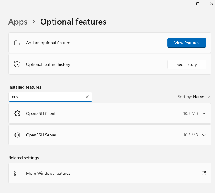 openSSH를 설치해준다. windows 설정에서 optional features를 검색하면 진입할 수 있다.