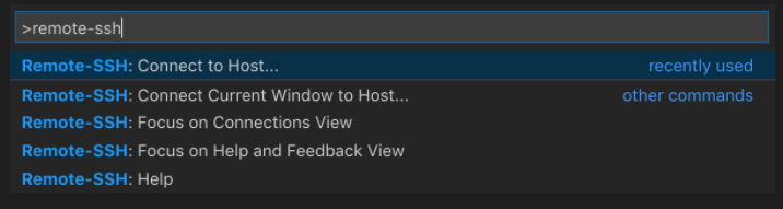 vscode에서 f1을 누르고 remote-ssh를 입력하거나 왼쪽 하단의 초록색 부분을 클릭하면 나음과 같은 화면이 나오는데, Connect to Host를 클릭한다.