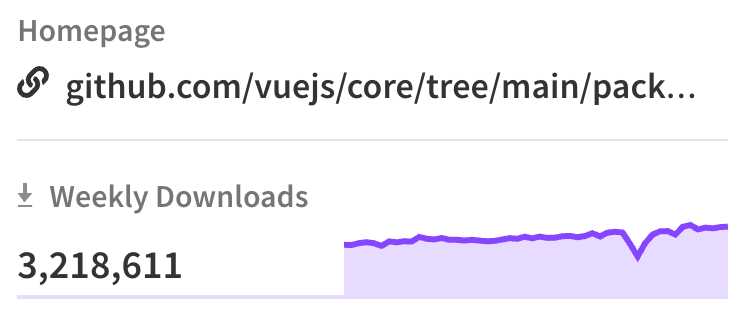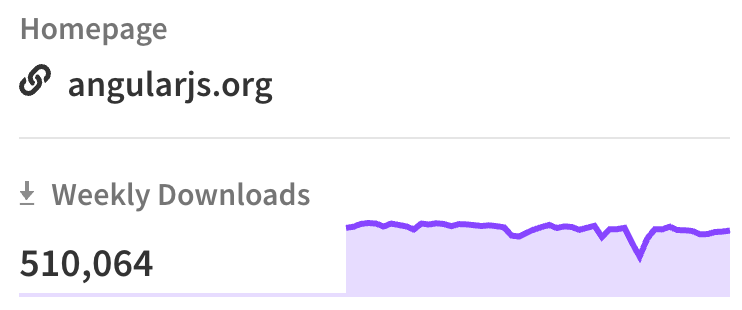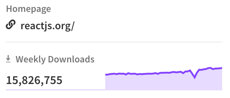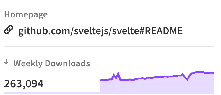 npm에서 살펴본 주간 다운로드수. react가 압도적으로 높고, 그 다음 vue가 따른다. angular와 svelte는 생각보다 더 다운로드 수가 적다.