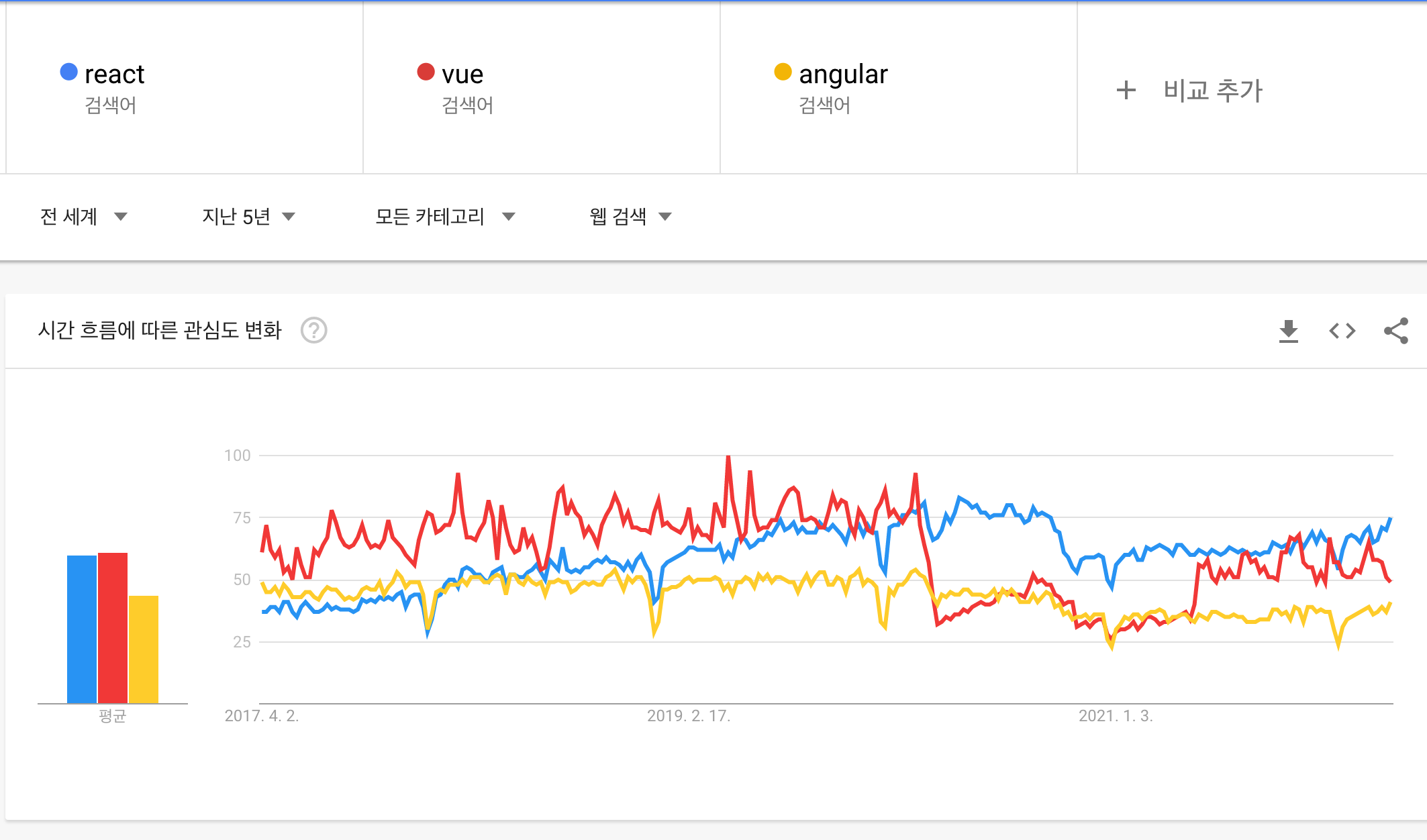 프론트엔드 프레임워크(라이브러리) 시장은 react.js와 vue.js가 양분하는 형태로 변화하고 있다. 사장되고있는 angular는 정말로 더 이상 사용되지 않는 모습을 볼 수 있다.
