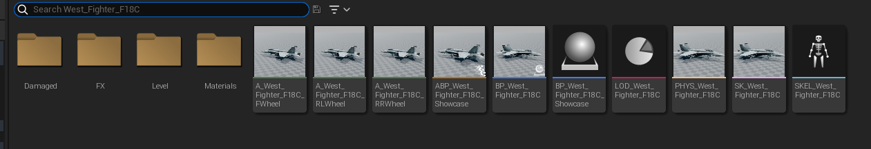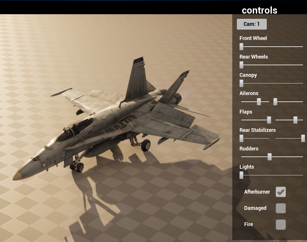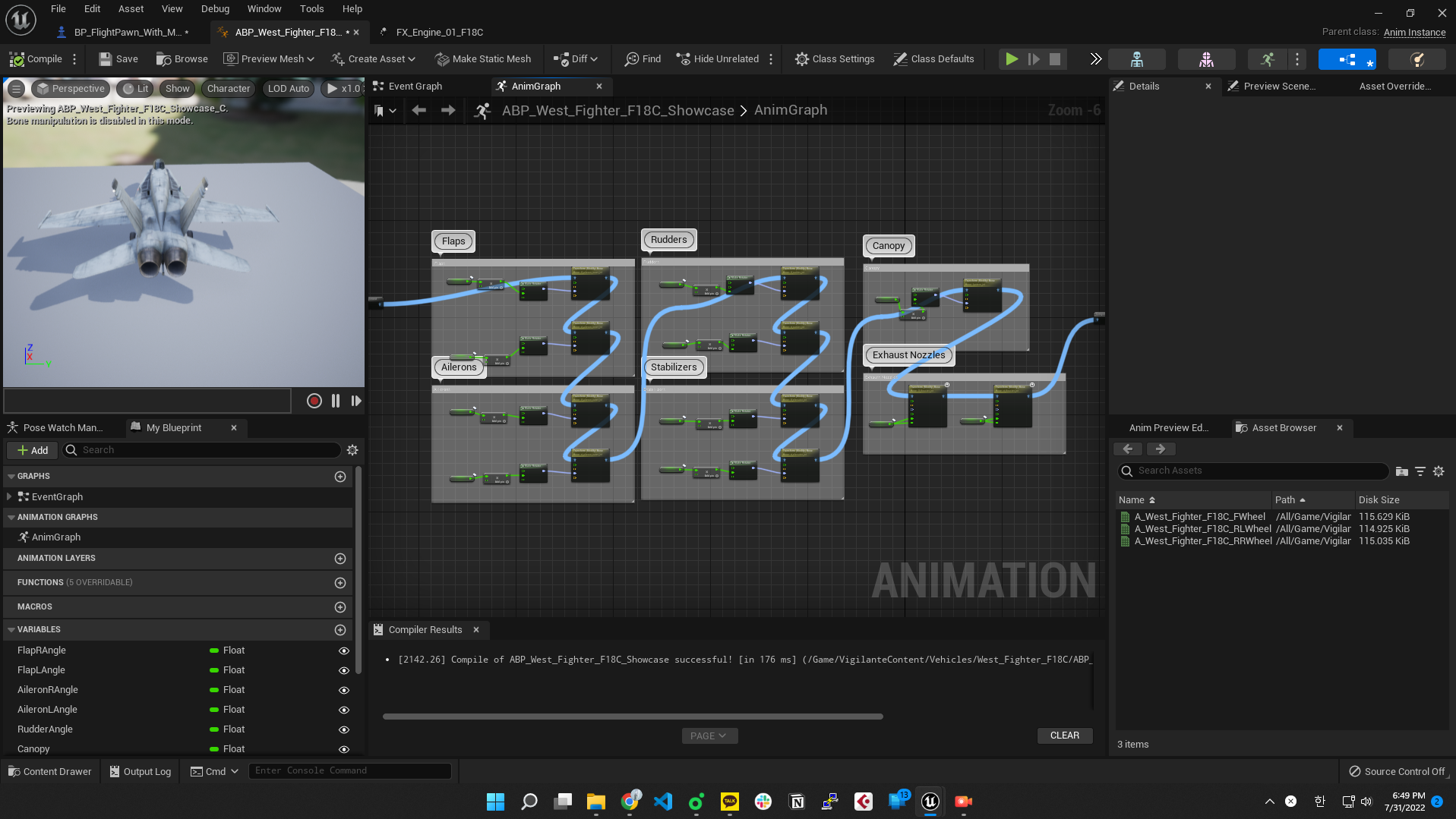 위 게시글들을 참고하여 전투기의 기본 구조를 알 수 있었다. vigilante에서 제공해준 animation blueprint(ABP_West_Fighter_F18C_Showcase)에 가보면 flap,aileron,rudder,stabilizer가 있는것을 확인할 수 있다.