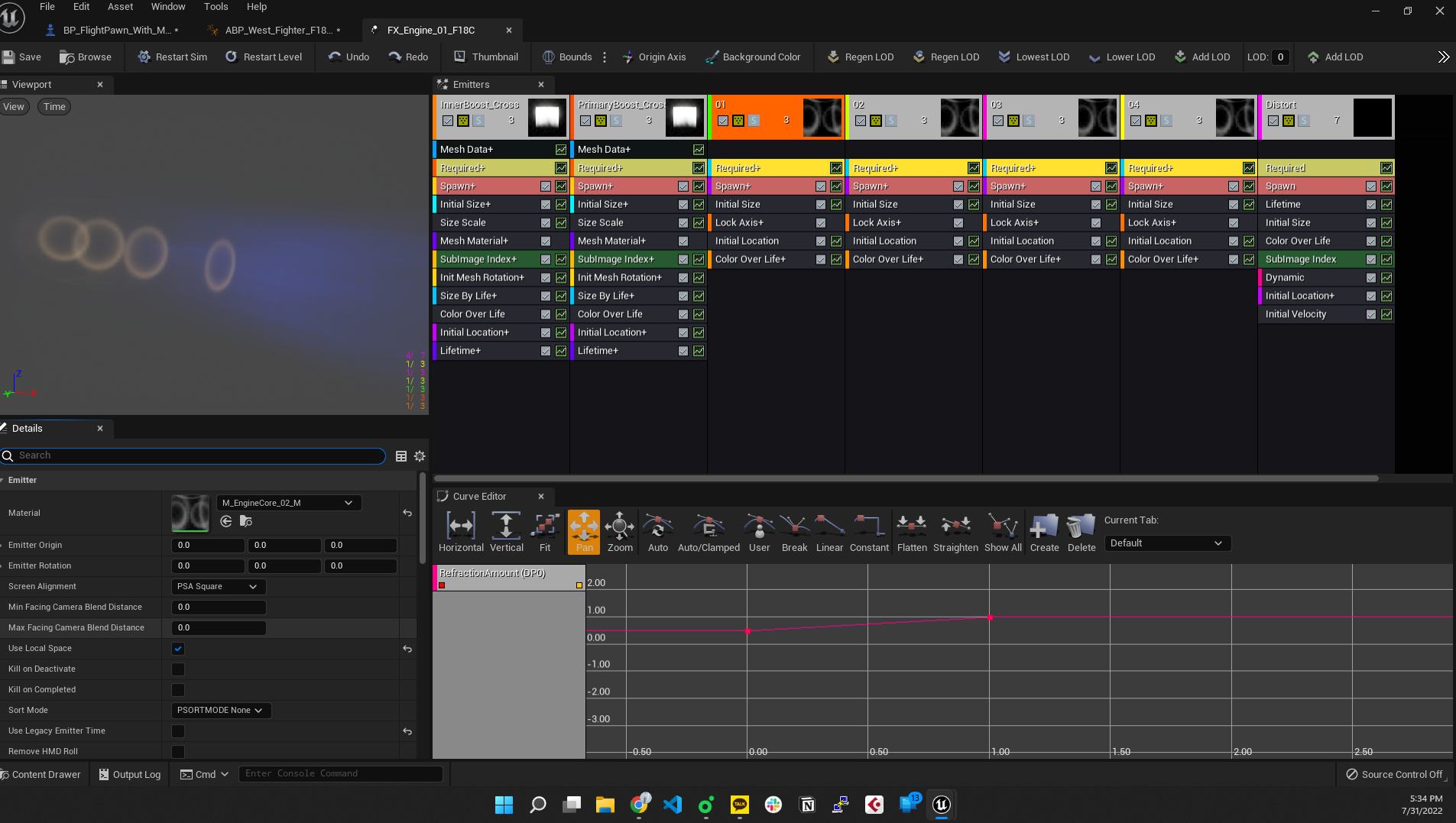 이 때, after burner의 원형고리 effect들이 기체를 따라가지않고, 최초 spawn된 위치에만 있는 것을 확인하였다. 검색해보니 local space로 fx를 세팅해야한다고 하더라. particle system파일에서 링들 하단에 있는 required+(사진에서 노란색)을 클릭 후, use local space 옵션을 true로 변경해주자.