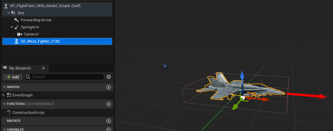 cube가 원래 차지하고 있던 부분을 collision box로 변경하고, 내부에 F-18 skeletal mesh를 넣어준다.