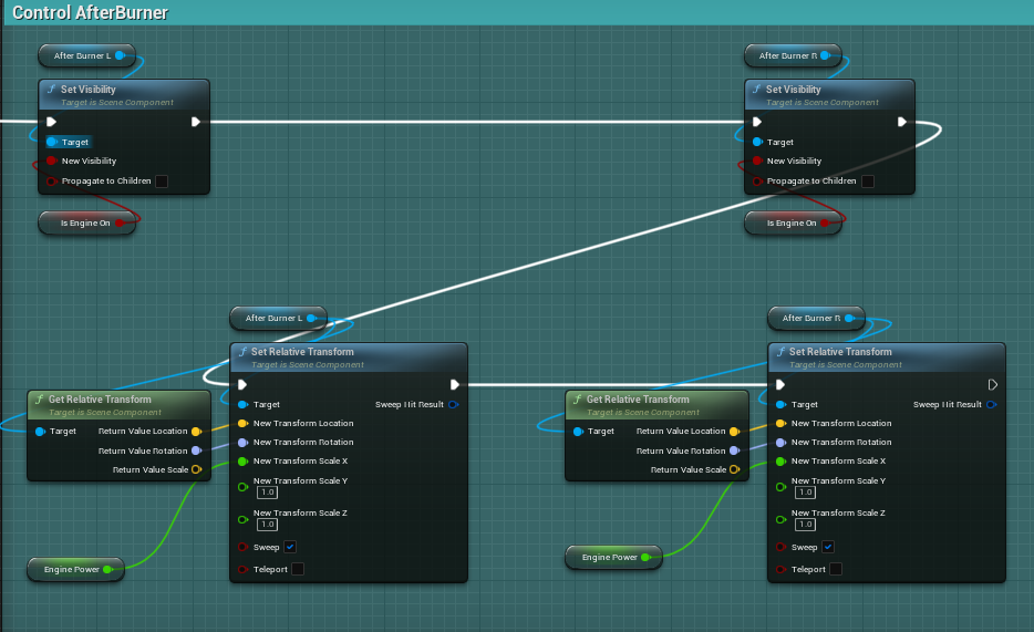기체 엔진 부분에서 나오는 연소불꽃을 after burner라는 fx로 제공해주고 있다. 이를 현재 기체에 잘 배치해 주고, engine power에 맞게 transform을 하여 크기를 변경시키도록 했다.