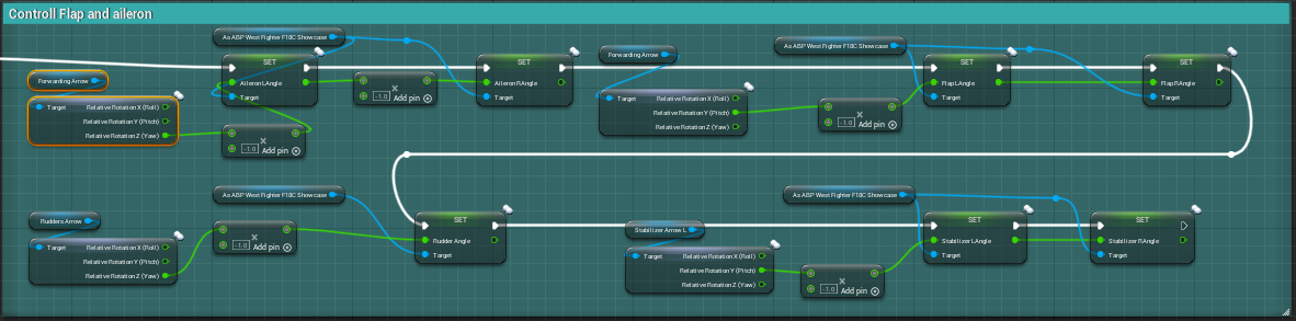 그리고 get anim instance를 사용하여서 해당 변수들을 제어한다. 제어할 값은, 기존에 설정한 arrow rotation에서 대부분 가져오고, rudders와 stabilizer의 행동은 구현되어 있지 않았으므로 추가로 구현해주어 넣어준다.