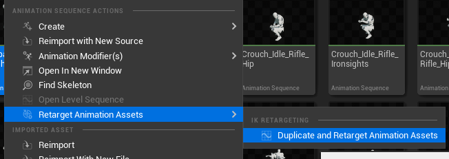 먼저 Animation Starter Pack의 Animation들을 따로 추려낸다. 그리고 Blend Space(주황색), Animation Sequence(연두색) 순서로 Retarget Animation Assets>Duplicate and Retarget Animation Assets를 클릭한다. 그러면 IK Retargeter를 넣으라 하는데, 이 때 RTG_UE4Manny_UE5Manny를 선택해준다.(Unreal Engine에서 migration을 고려해서 미리 넣어준 것으로 보인다! 감사하다)
