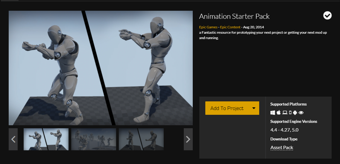 기본 달리기, 점프 애니메이션은 UE4, UE5 상관없이 프로젝트를 생성하면 기본으로 제공하기에 바로 사용할 수 있지만 Asset store에 free로 올라온 Animation Starter Pack은 UE4에의 Mannequin에서만 사용가능하다.