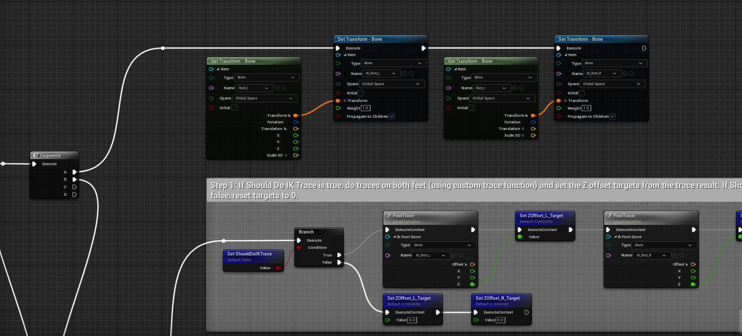 그 CR_Mannequin_BasicFookIk에 들어가서 위와 같이 Bone Get/Set Transform을 추가해주면 모든 애니메이션이 잘 작동한다! UE5의 IK_foot에 대응하는 node(bone)이 UE4에 없어서 생긴 이슈가 아닐까 생각한다.