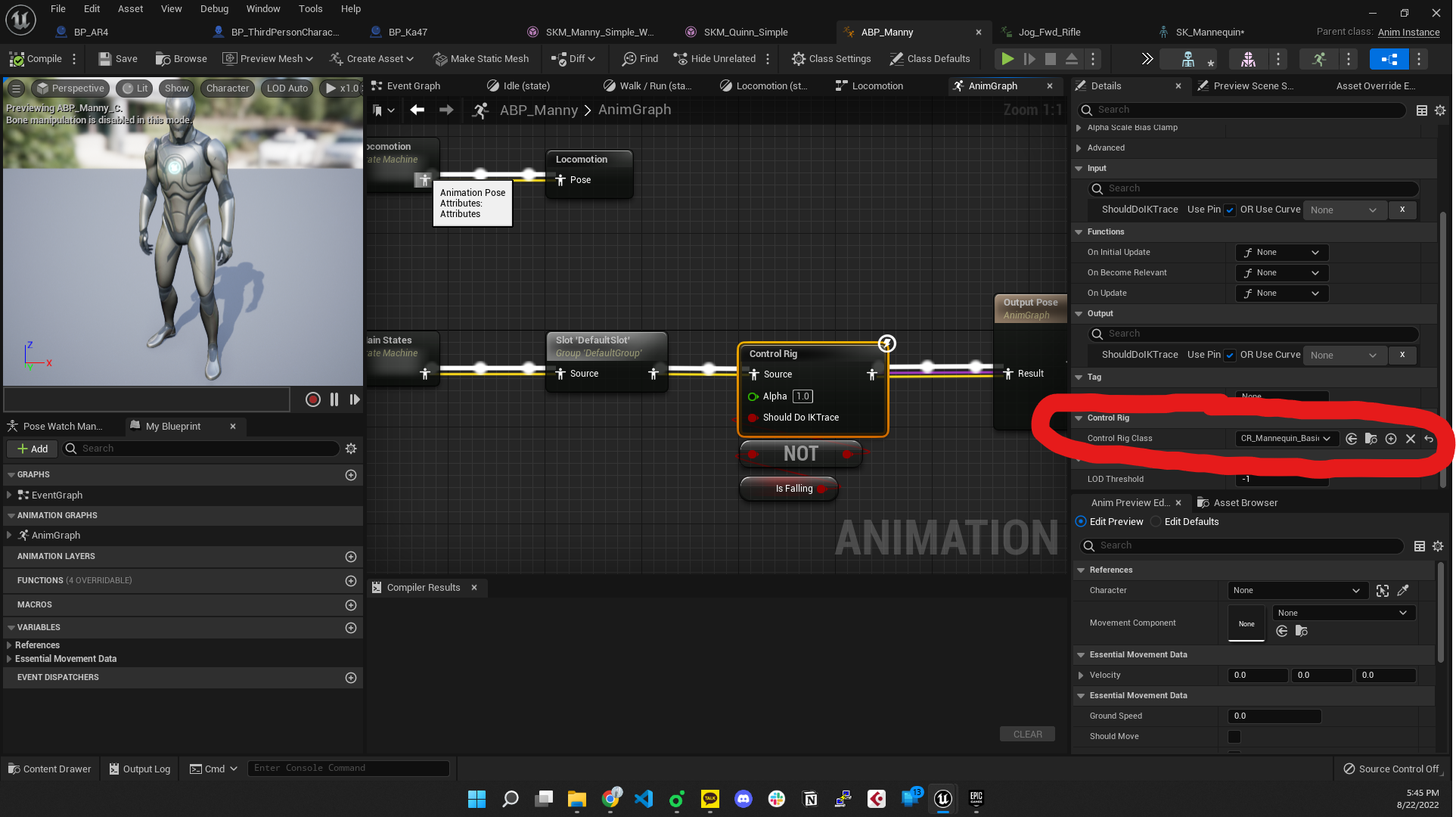 먼저 사용할 UE5 캐릭터의 Animation Blueprint(ABP)에 들어가면 Control Rig 노드가 있고, 해당 노드에는 CR_Mannequin_BasicFookIk가 할당되어 있을 것이다.