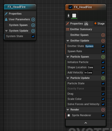 Niagara System을 생성할 때, 제공되는 Fountain Template을 조금 변경하여서 사용하였다. 매우 다행인것, Material을 위와 같이 설정해주면 기본적으로 사각형 모양으로 Rendering이 된다는 것, 그래서 추가적인 작업 없이 현재 디자인에 사용할 수 있는 형태의 Sprite가 나왔다.