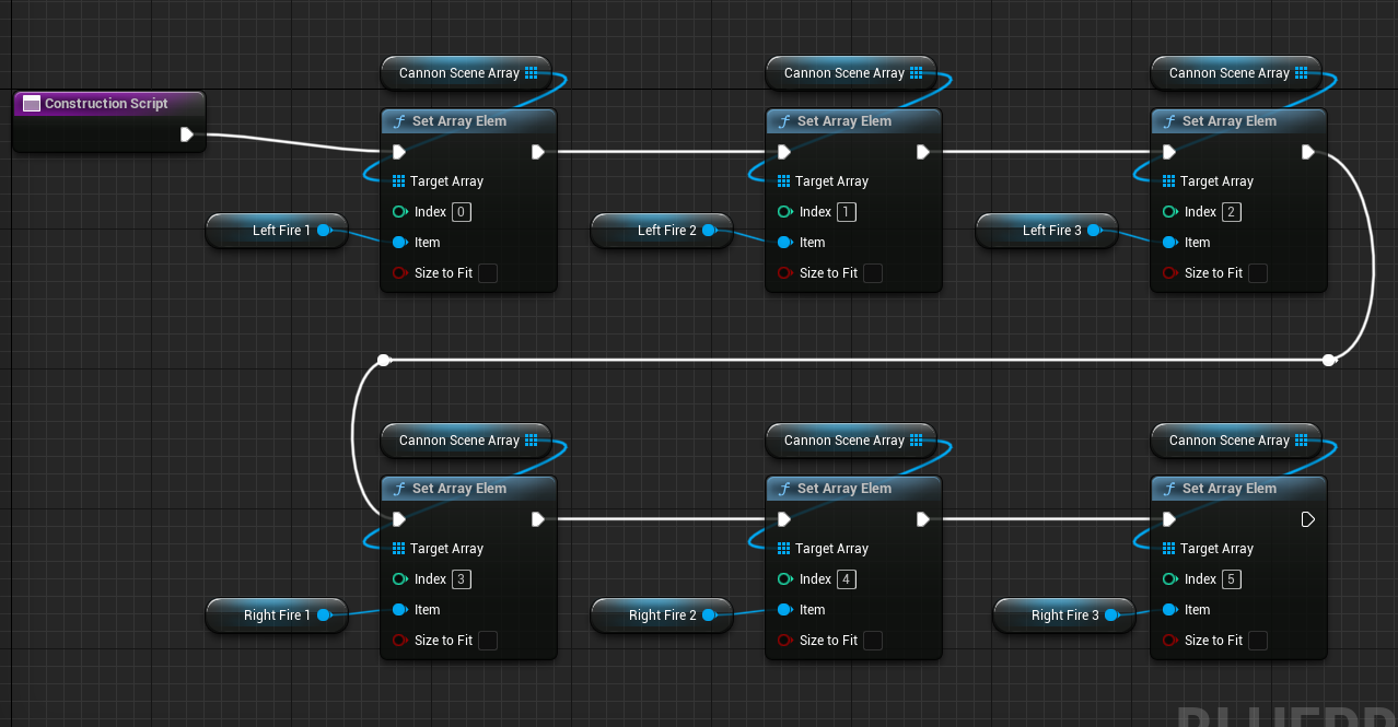 그리고 각각 대포들을 BP로 설정해야한다. 이 때, BP_Cannon이란 부모 클래스를 설정하고, 개별 대포들은 BP_XXXCannon으로 자식 클래스로 구현하였다. 대포의 Static Mesh Component의 collision이 ignore되지 않으면 거북선이 제대로 컨트롤 되지 않는 문제가 있었기 때문에, BP_Cannon의 Construcion Script에서 Static mesh의 collision을 설정해준다.